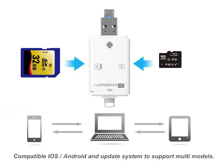 This Hybrid USB Card Reader is so cleverly designed that is compatible with both Mac and Windows laptops or PCs and also with Apple Devices like iPhones or iPads, and Android Smartphones.