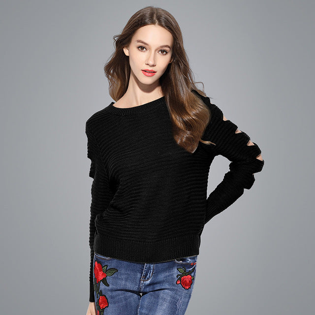 One Size Full Sleeve Hollowed Out Knitted Sweater - Black