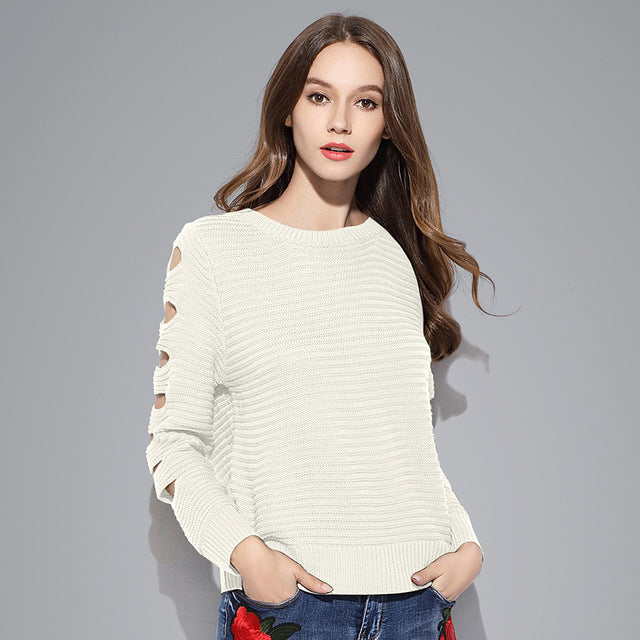 One Size Full Sleeve Hollowed Out Knitted Sweater - White